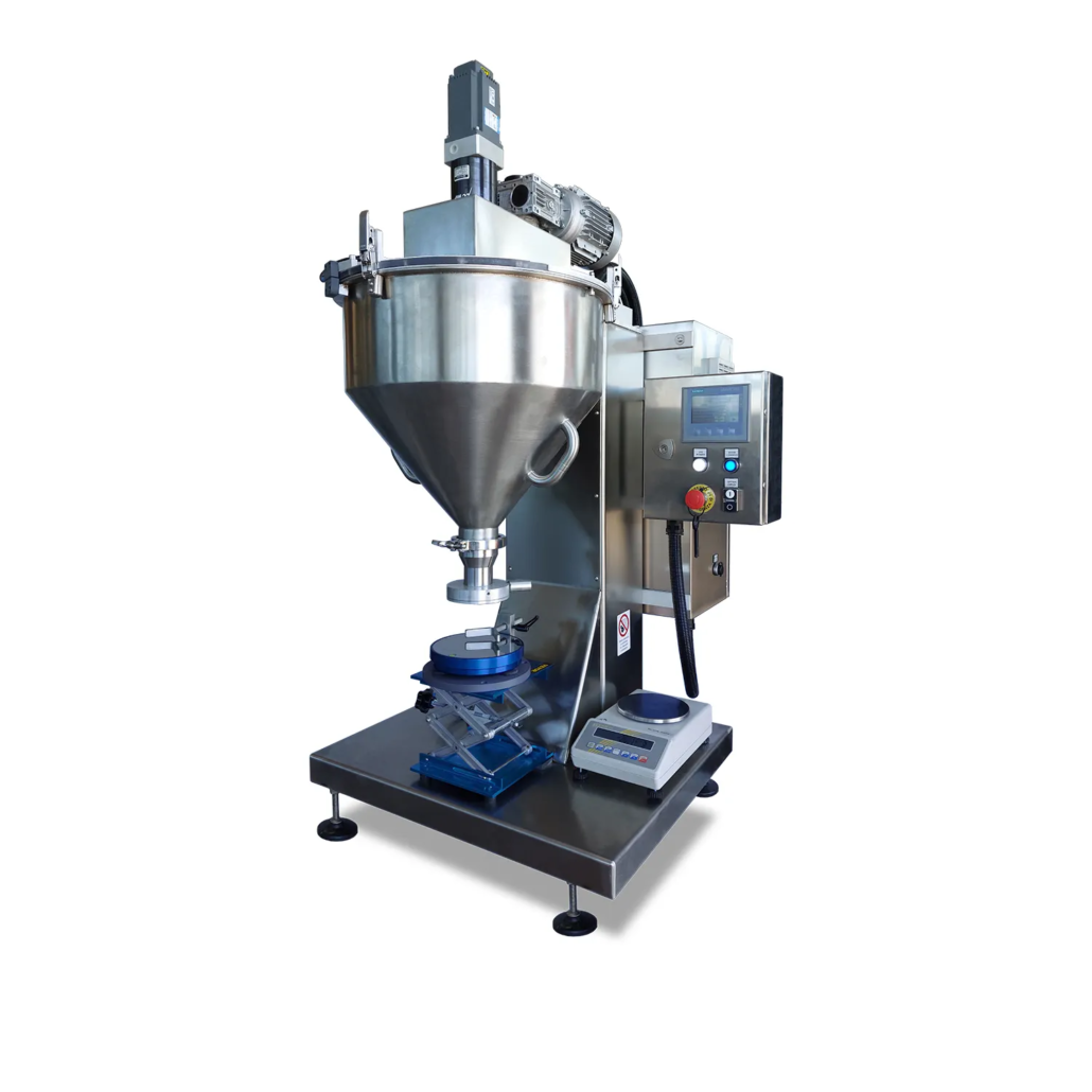 Macchina dosatrice volumetrica a coclea per polveri, sistema semiautomatico per il dosaggio ad alta precisione di polveri secche alimentari, chimiche e cosmetiche.